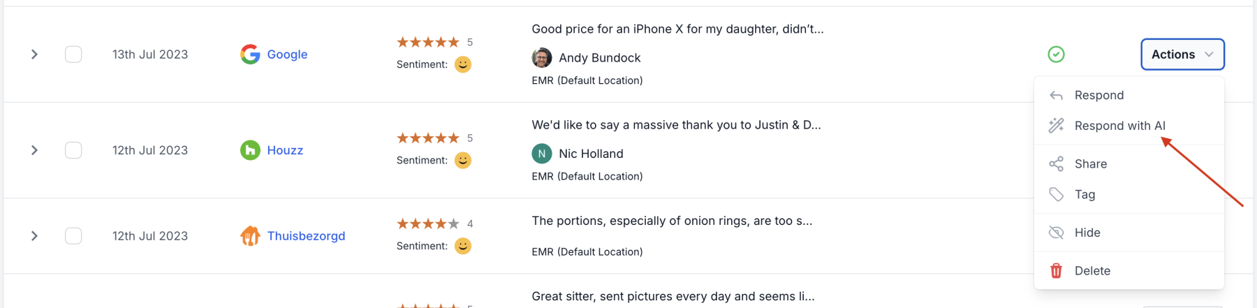 Responding with AI is now supported on most review sources and is not limited to just Google and Facebook. The generated response will be copied to the users clipboard and then they will redirected to the review site to respond to the review.