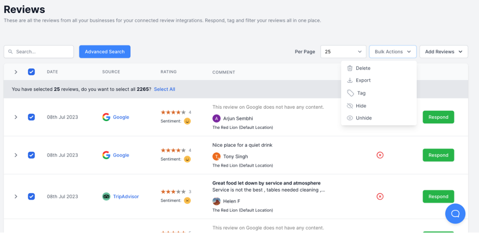 To get started select the reviews you would like to tag and then under Bulk actions click tags.
