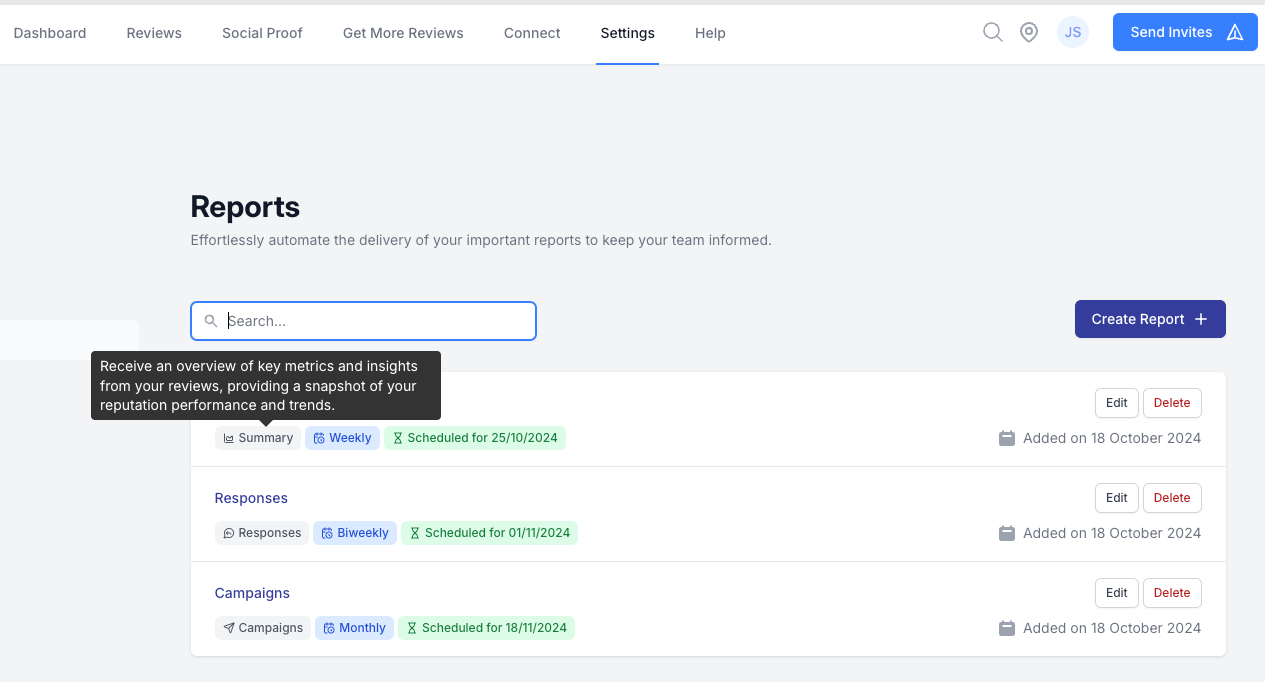 Summary - Get an overview of key metrics and insights from your reviews, offering a snapshot of your reputation performance and trends.